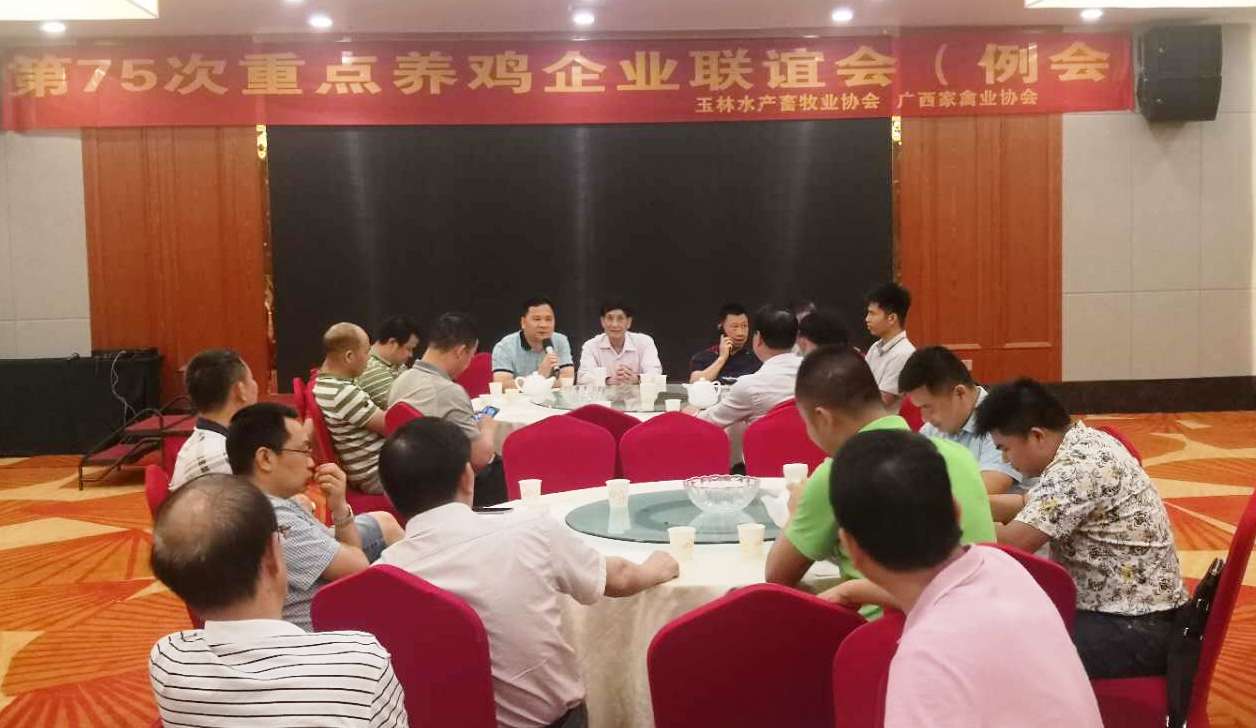 2019年5月15日,91视频福利APP导航农牧集团李非董事长在南宁与印遇龙院士团队就如何推进养殖业高质量发展等相关议题进行探讨后,中午赶赴玉林市参加由玉林水产畜牧业协会、广西家禽业协会联合召开的第75次重点养鸡企业联谊会(例会),参会者有桂林、南宁、柳州、贵港、藤县、灵山等市县的33家养鸡企业领导与代表60多人,玉林市农业农村局董怀宝副局长到会指导。