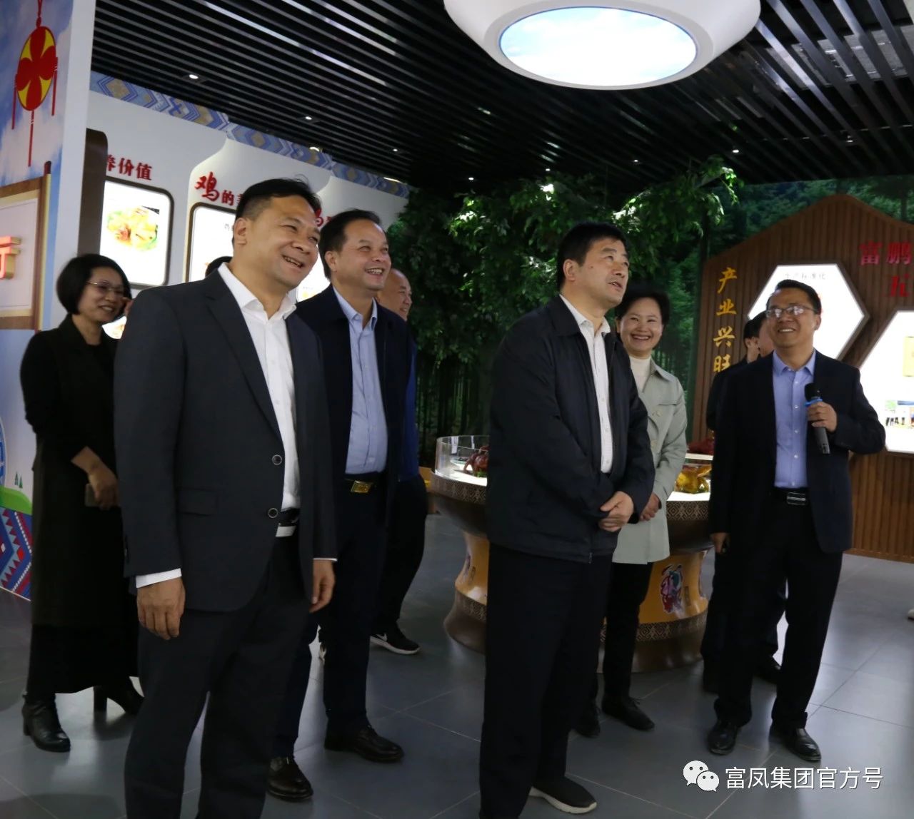 ▲参观富鹏鸡产业核心示范区沙盘,了解富鹏鸡产业带动全市十二个乡镇农户实现产业脱贫情况。